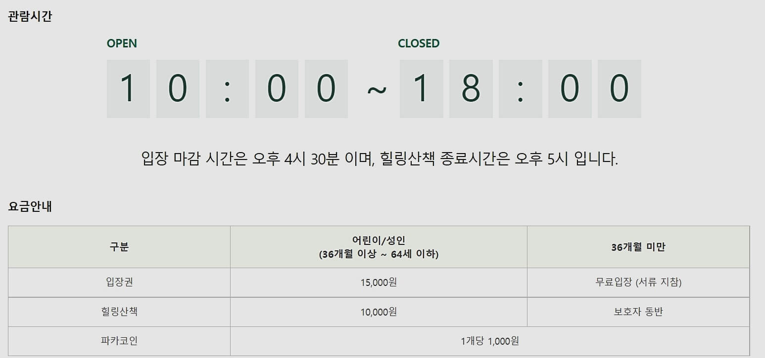 알파카월드는 오전 10시부터 오후 6시까지 운영되고 있습니다. 입장 마감 시간은 4시 30분, 힐링산책 코스의 종료시간은 오후 5시라고 하네요. 알파카월드 입장요금은 입장권 15,000원, 힐링산책 10,000원이며 36개월 미만 아이들은 서류지참시(의료보험증, 주민등록등본) 무료로 입장이 가능합니다. 네이버페이 예약시 5% 할인을 받으실 수있어서 미리 예매하고 가시면 더 저렴하게 이용하실 수 있어요.