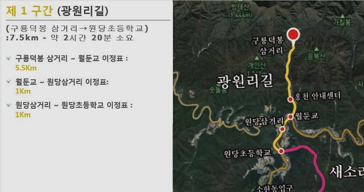 백두대간 트레일 홍천 코스 중에 광원리길은 5월-11월까지 예약 후 이용하는 구간이라 미리 문의를 하시고 가시는 것이 좋습니다.(033-434-8006) 안내센터는 월요일 휴무여서 월요일을 제외한 요일에 오전 9시-오후6시 중에 문의해보시면 되겠습니다.