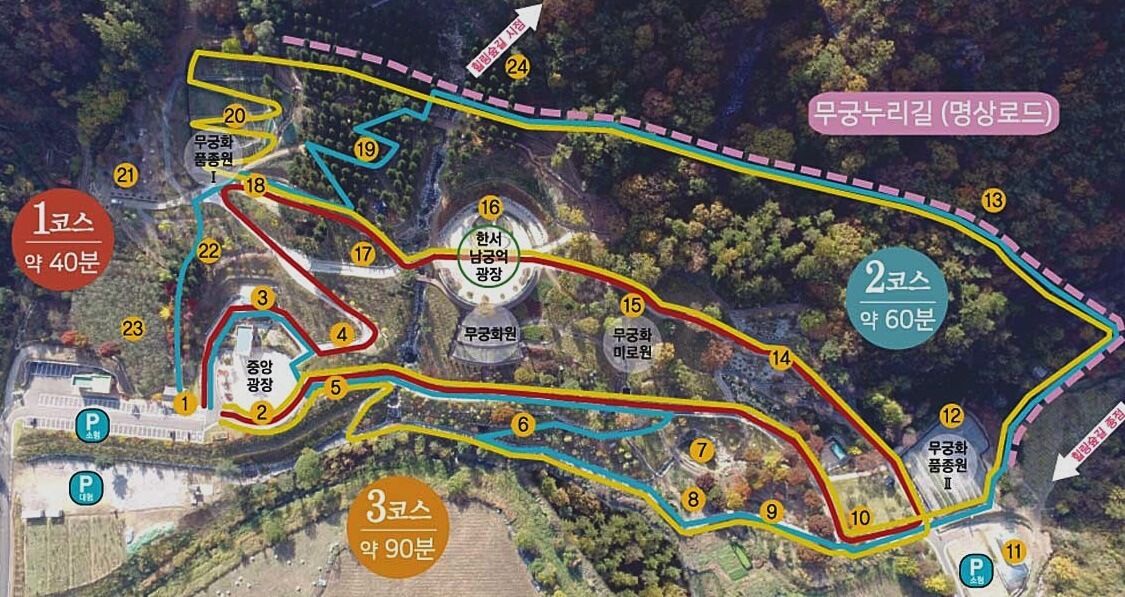 무궁화 수목원의 코스는 3코스가 있는데요. 1코스는 무궁화길로, 중앙광장-억새원-무궁화원-암석원-분재온실-무궁화품종원(2)-무궁화미로원-한서 남궁억 광장-어린이 놀이터-무궁화 품종원(1)-장미과원-전시온실-중앙광장 이며 약 40분 정도가 소요됩니다.