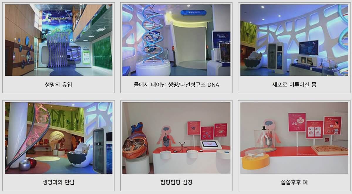 제1전시실에서는 생명의 유입과 세포, DNA, 폐, 심장 등 인체를 탐험할 수 있는 구조물들이 여럿 있어요. 제2전시실에서는 자연 속 생명은 어떤 것이 있는지, 신체로 오감을 느끼는 방법에는 어떤 것들이 있는지 알아볼 수 있게 전시되어 있습니다.