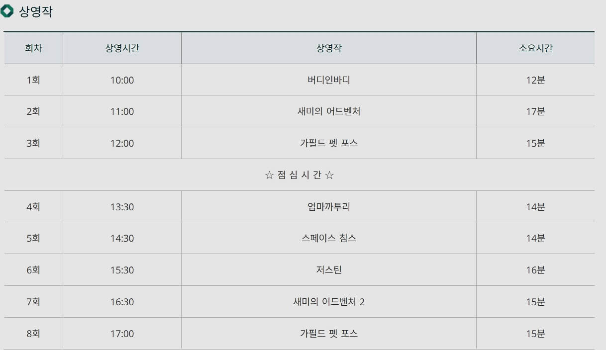 3D 영상관에서는 짧은 영상들을 시청하실 수 있어요. 10시 버디인바디, 11시 새미의 어드벤처, 12시 가필드 펫 포스, 13시 30분 엄마까투리, 14시 30분 스페이스 침스, 15시 30분 저스틴, 16시 30분 새미의 어드벤처 2, 17시 가필드 펫 포스를 상영하고 있습니다. 시간은 15분내외로 짧은 편이에요.