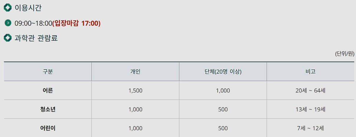 이용시간은 오전 9시부터 오후 6시까지이며 입장 마감 시간은 오후 5시입니다. 관람 요금은 성인 1,500원, 청소년과 어린이는 1,000원입니다. 어린이는 7세부터 12세까지입니다.