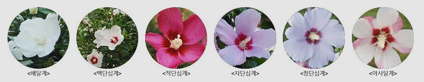 배달계는 꽃 중심부에 단심이 없는 순백의 꽃, 단심계는 꽃 중심부에 붉은 계통의 무늬가 있는 꽃, 아사달계는 연한 분홍색 또는 흰색 꽃잎 가장자리에 붉은 무늬가 있는 꽃이라고 합니다.