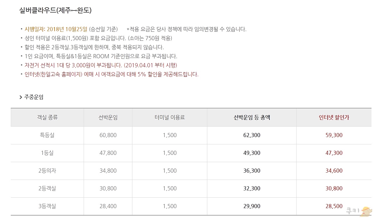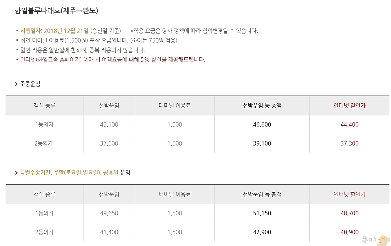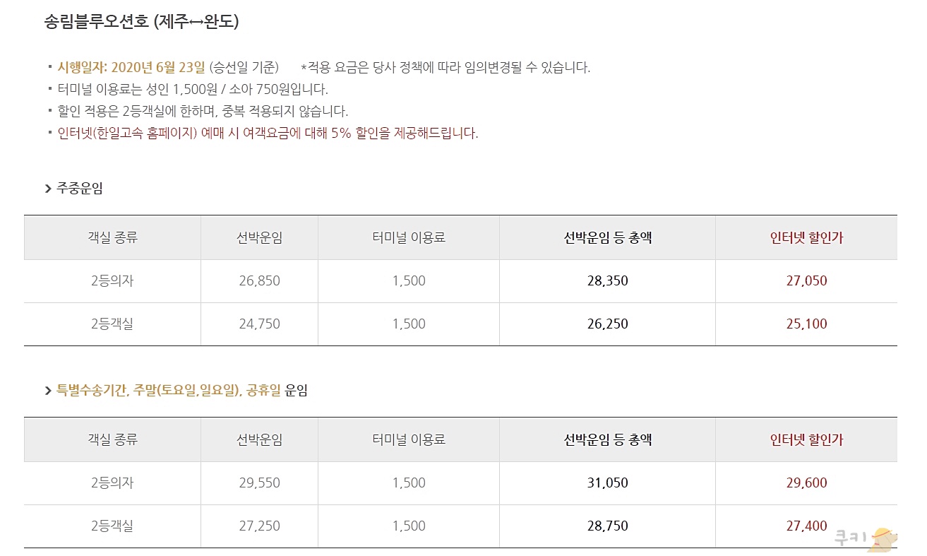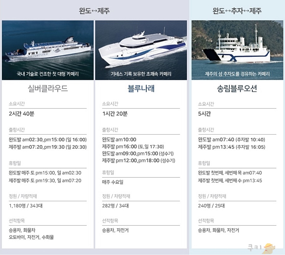 완도 제주도 배편요금 및 선임료 안내