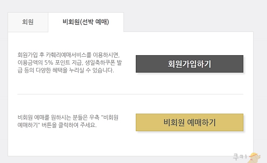 한일 고속 홈페이지에서 예매를 진행해봤더니 승선료가 정상 금액 46,600원이었는데 인터넷 예매 할인 혜택으로 2,200원 할인되어 44,400원에 예매를 할 수 있습니다. 배편마다 요금이 조금씩 상이하네요. 비회원 예매 혹은 회원가입 후 예매를 하실 수 있습니다.