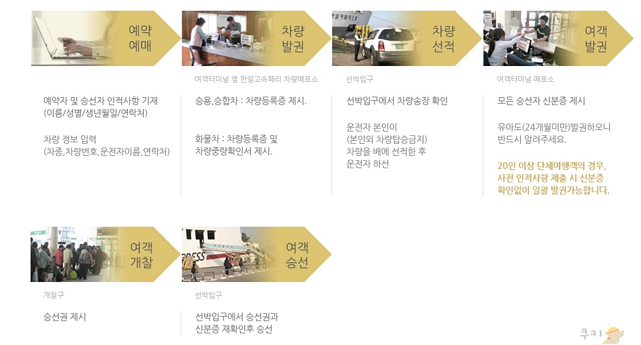 종종 배가 정시보다 일찍 출발하기도 하고, 신분 확인, 차량수속 등을 다 완료한 후 출발하기 때문에 출발 시간보다 넉넉하게 도착하시는 것이 좋습니다. 여객 분들은 40분 전까지, 차량을 같이 싣는 분들은 1시간에서 1시간 반 전에 미리 갑니다. 발권마감시간은 출항 10분 전, 승선마감시간은 출항 5분 전에 마감이 됩니다.