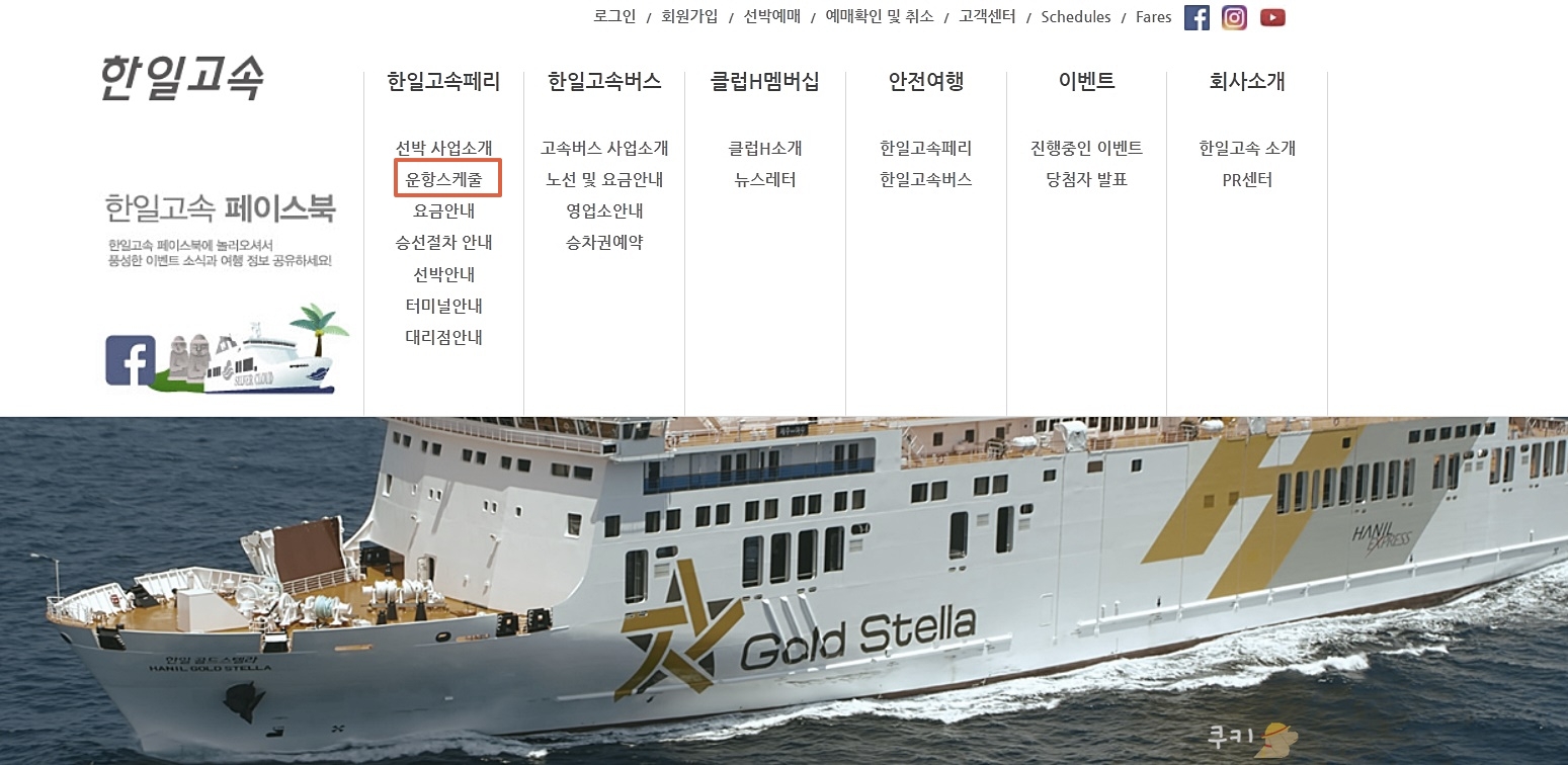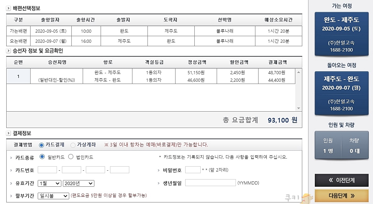 한일고속 홈페이지에 접속하면 완도-제주행 선박 일정을 보실 수 있습니다. 인터넷으로 예매하시는 경우 5% 할인을 받으실 수 있으며, 회원 예매를 하면 운임의 5%를 포인트 적립해줍니다. (만 2세 미만은 요금을 받지 않습니다.)