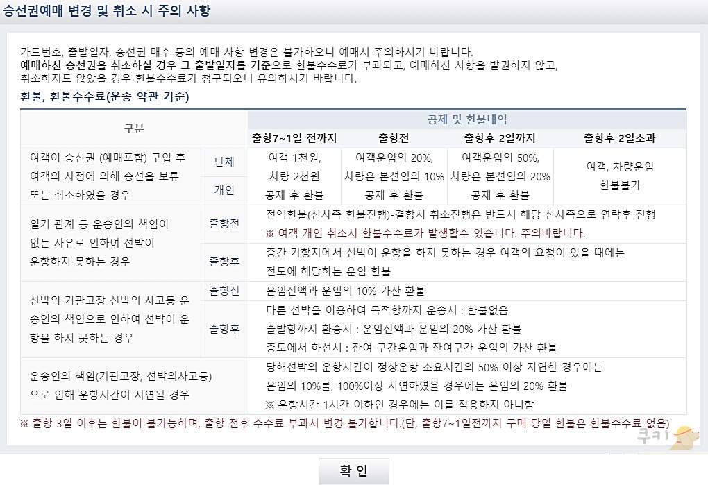 환불을 하게 되는 경우 출항 하루 전부터 일주일 전까지는 여객 1,000원, 차량은 2,000원 빼고 환불을 받습니다. (구매 당일은 수수료 없음) 출항 당일날 환불을 하게 되는 경우 운임의 20%, 차량은 본선임 10%를 빼고 환불을 받습니다. 기상 상황 악화 등으로 피치 못하게 결항되는 경우에는 선사측에 확인 후 전액 환불 진행을 합니다.