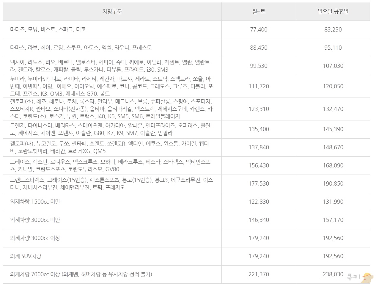티코, 모닝, 마티즈, 스파크, 비스토는 77,400원, 레이, 라보, 르망, 다마스, 스쿠프, 아토스, 엑셀, 프레스토, 타우너는 88,450원입니다. i30, SM3, 프라이드, 티뷰론, 클릭, 투스카니, 캐피탈, 칼로스, 엘란트라, 젠트라, 엑센트, 엘란, 씨에로, 아벨라, 슈마, 세피아, 벨로스터, 베르나, 리오, 라노스, 넥시아는 99,530원을 받습니다.